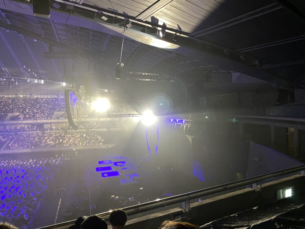 ステージセットはテレビスタジオや放送局を模したデザインで、巨大なLEDスクリーンにはノイズやカラーバー、オンエアサインなどの映像演出が展開され、レトロフューチャーな雰囲気を醸し出していました。東京体育館という歴史あるアリーナが、この日だけの特別な「放送局」へと変貌を遂げたのです。