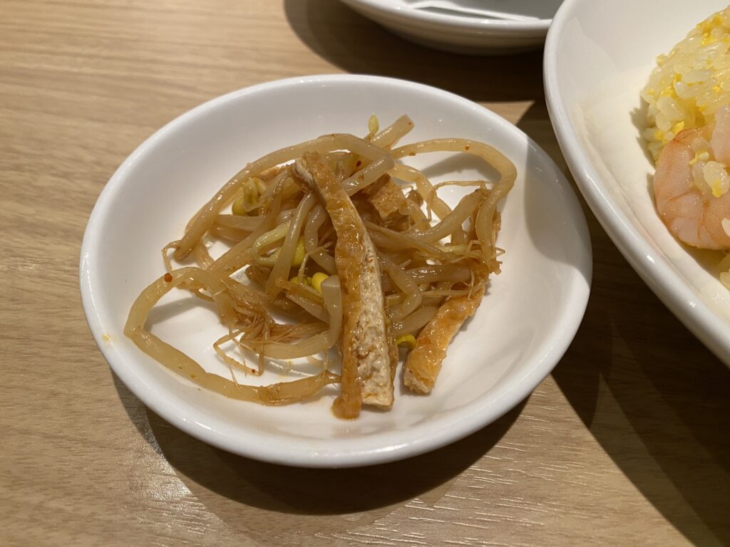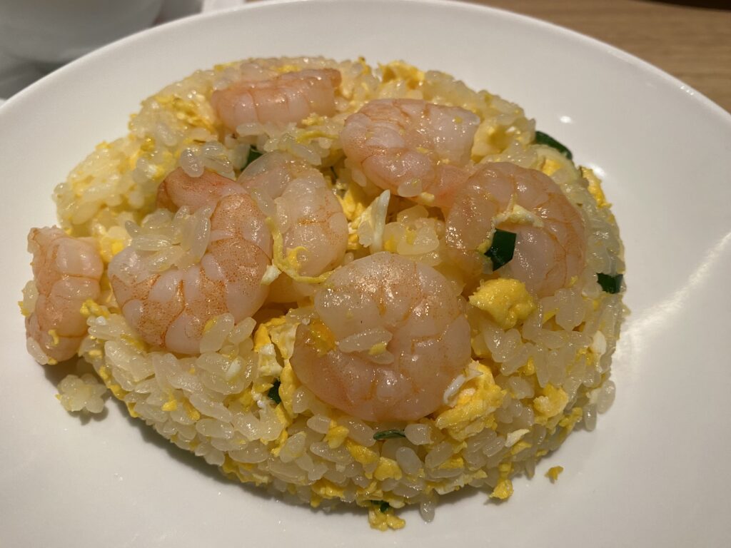 まずはえび入りチャーハンから。見てください、この大きな海老!プリプリの食感と、パラパラに炒められたご飯が絶妙にマッチしています。塩味ベースのシンプルな味付けなので、小籠包の繊細な味を邪魔せず、子供でも美味しく食べられます。