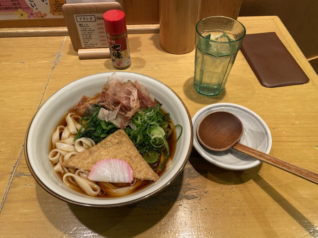 21:00に訪れた店内は、駅の喧騒が嘘のような落ち着いた空間。明るく清潔で、一人でも利用しやすいカウンター席とテーブル席があります。私が注文したのは、基本の「きしめん」(750円)です。