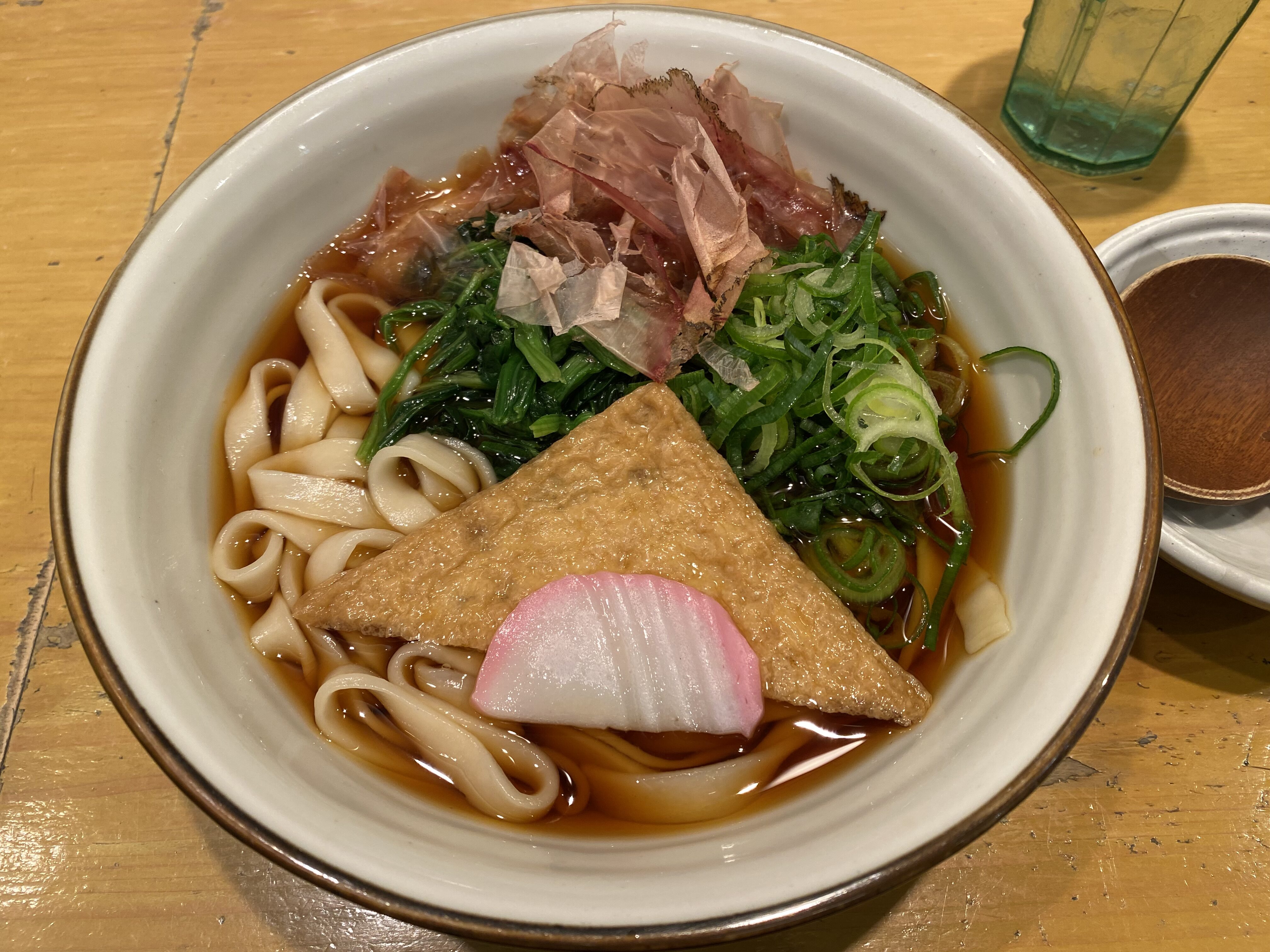 つゆは醤油、塩、味噌の3種類から選べ、出汁は毎日丁寧に作られています。定番のきしめんには、ほうれん草、かまぼこ、そして風味豊かな花かつおがたっぷりと乗せられています。