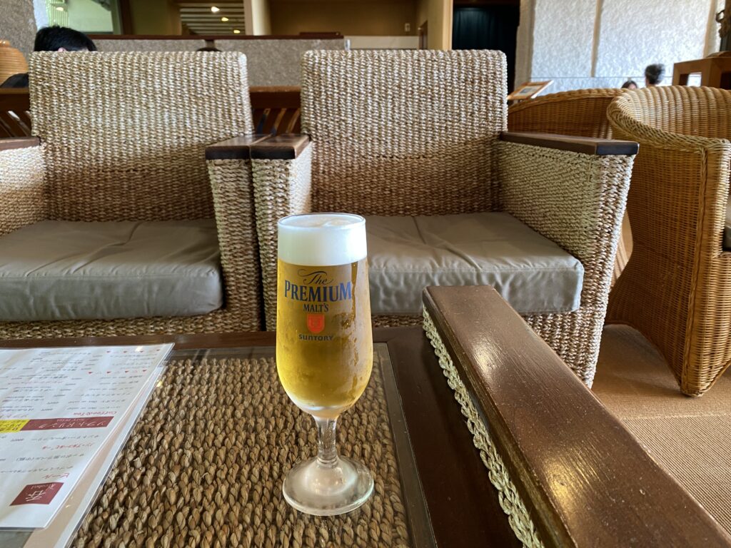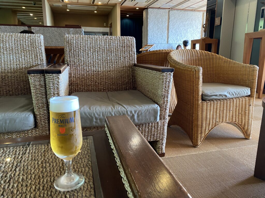 サウナと温泉でしっかりととのった後は、2階にある展望ブースへ。ここで注文したのは、キンキンに冷えた生ビールです!
