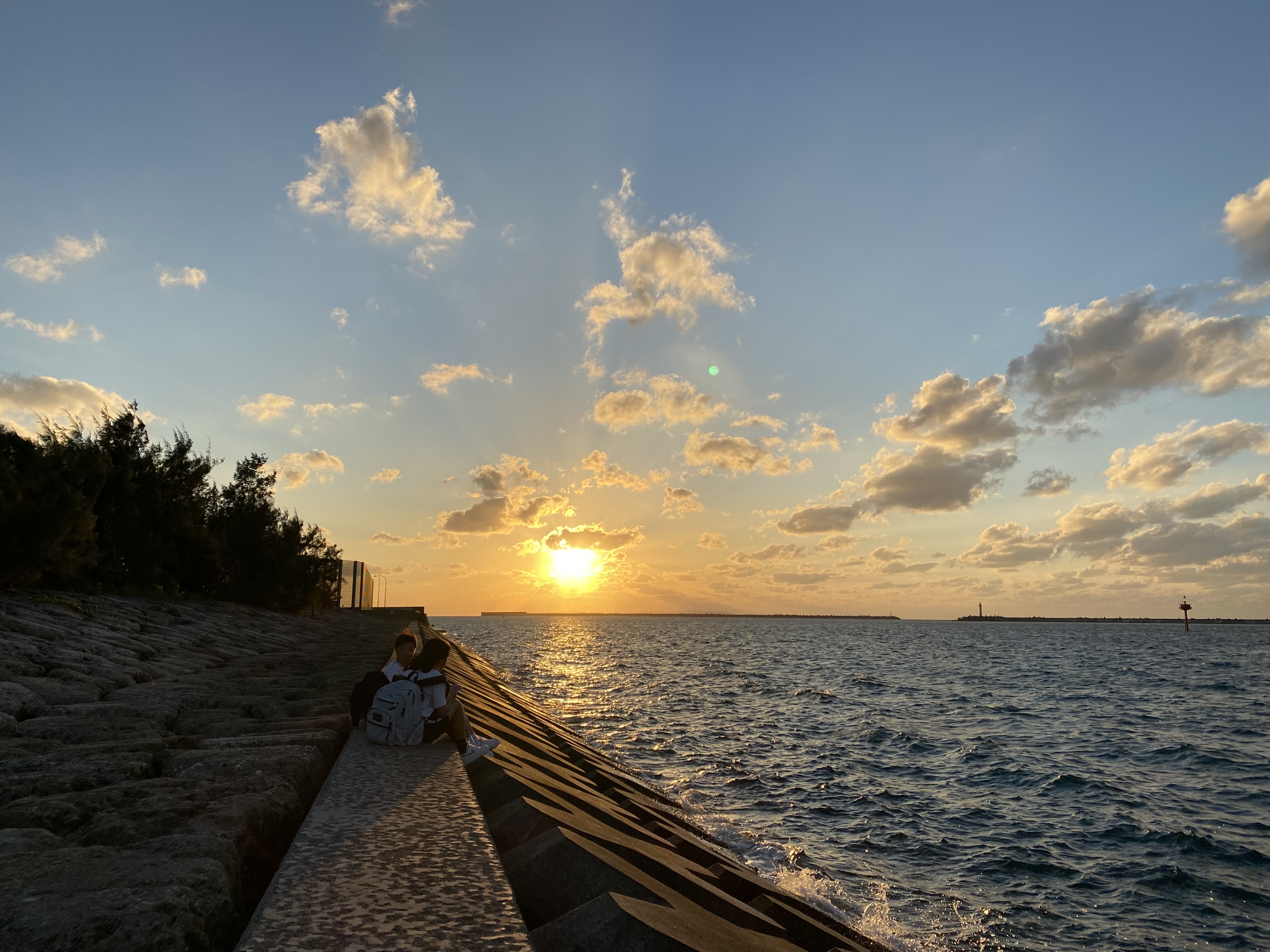 東シナ海に沈む美しい夕日を眺めながら、頭上を通過する飛行機や、港を出入りする大型客船を眺める。そんなダイナミックな景観は、この場所でしか味わえません。オリオンビールを片手に、この最高の時間を過ごせたことは、旅の忘れられない思い出となりました。